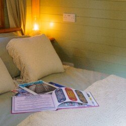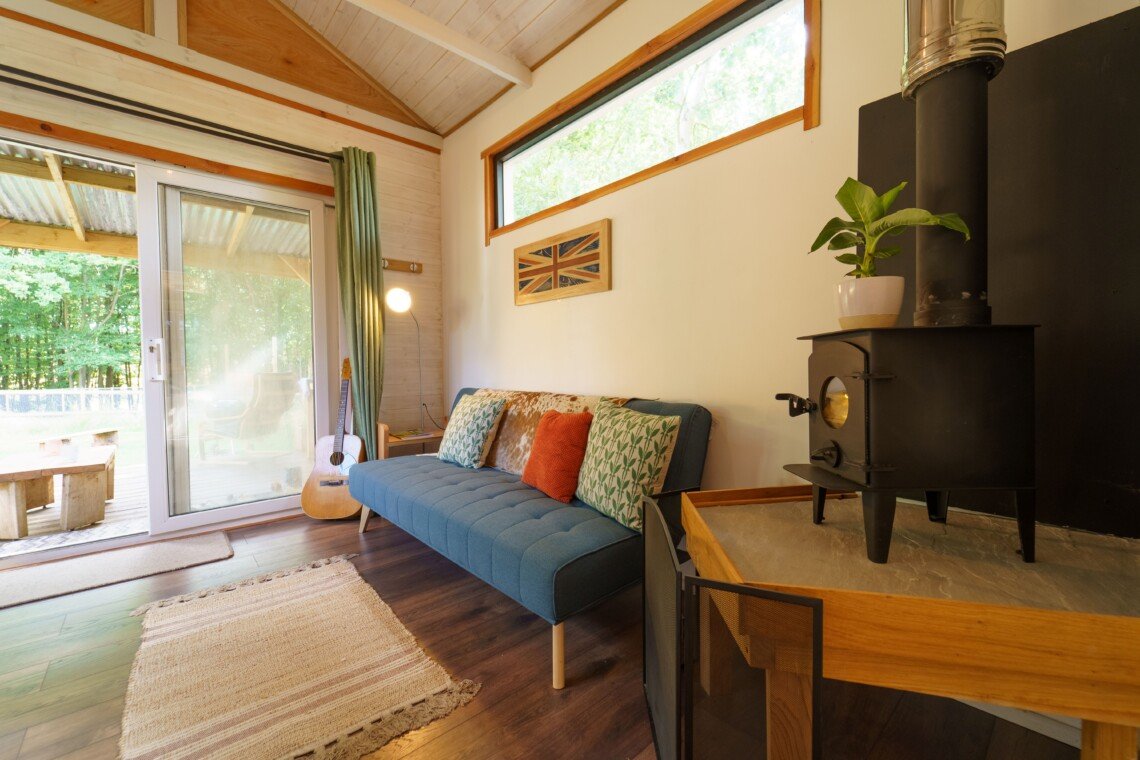 The living area offers a log burner which is plenty to heat the whole cabin on the chilly nights. You have a sofa to relax on and a window seat with dining table for meals or if you need to plug in the laptop and catch up on some video editing from the days activities.